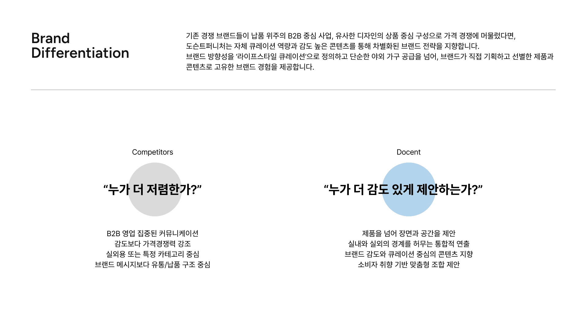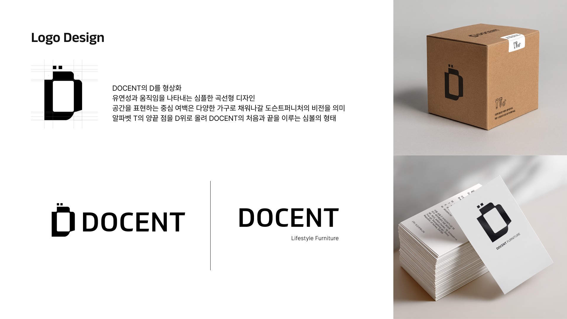 DOCENT FURNITURE는 단순한 가구 유통 브랜드에서 벗어나, 삶의 장면을 큐레이션하는 라이프스타일 브랜드로 리브랜딩되었습니다. 로고는 ‘D’를 모티브로 한 곡선형 디자인으로, 공간 안에서 자유롭게 변주되는 브랜드의 감도를 상징합니다.