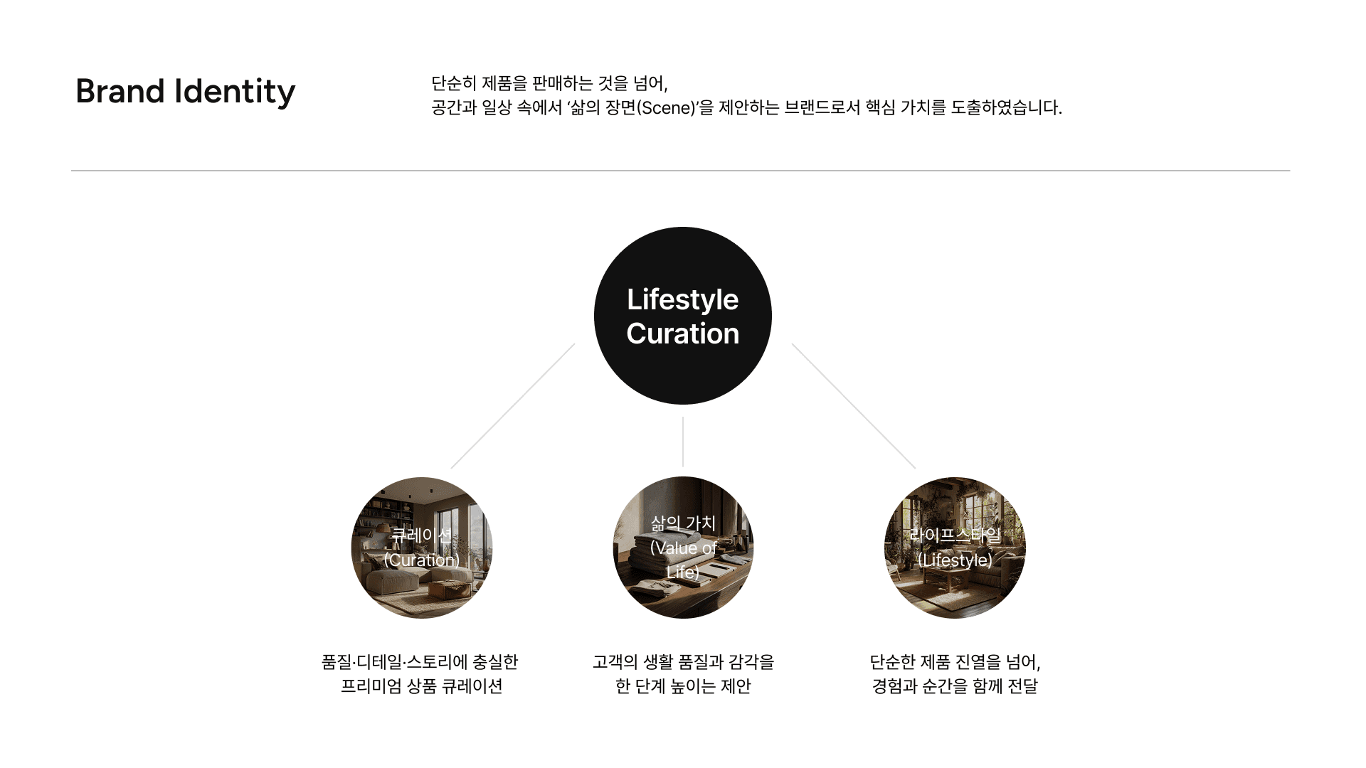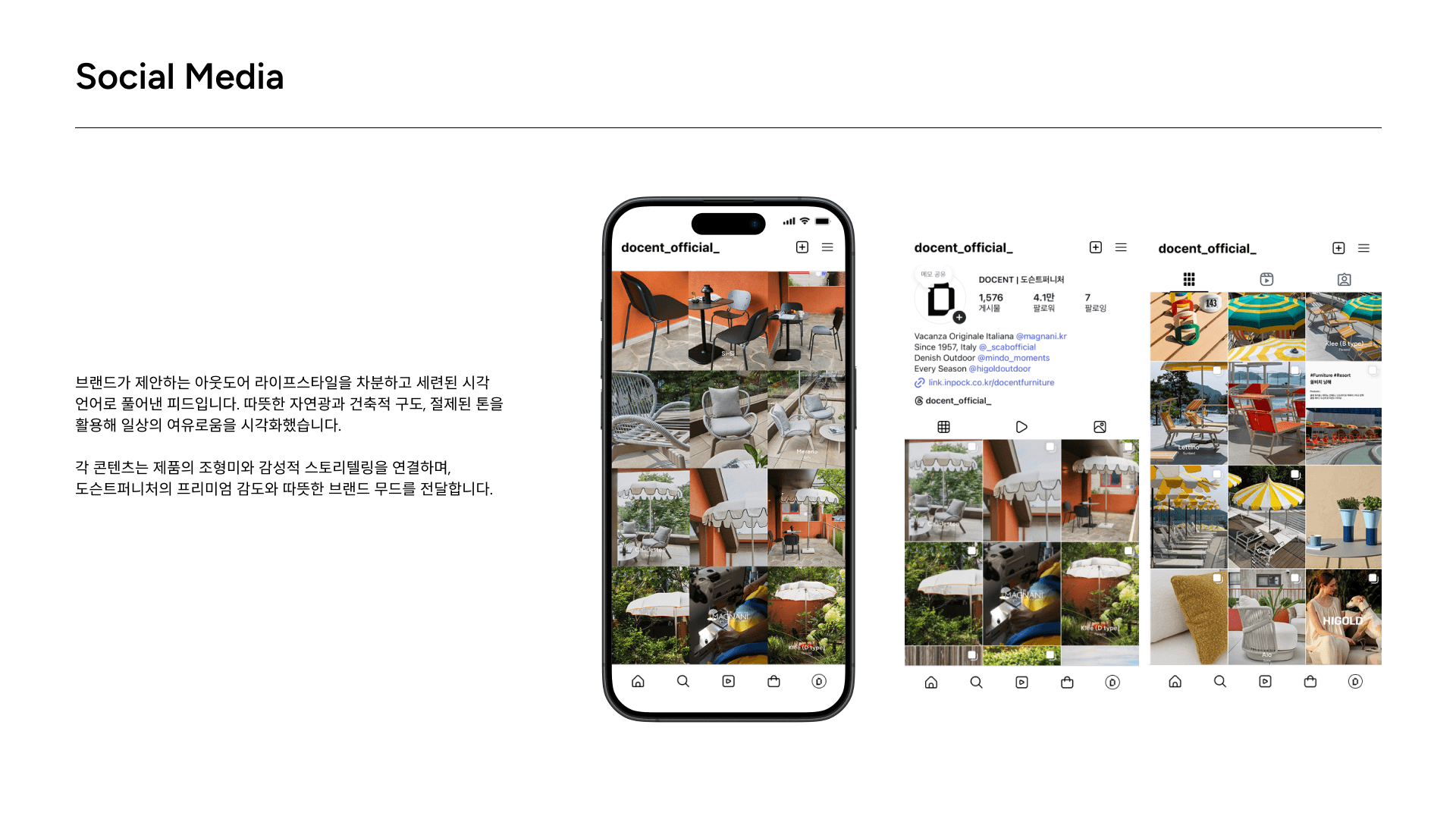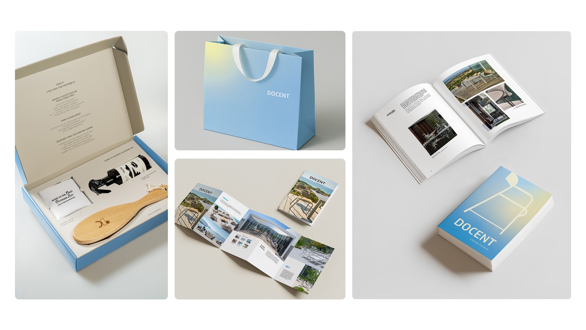 컬러와 타이포그래피는 자연에서 영감을 받은 부드럽고 세련된 톤으로 구축해 감성적이고 일관된 브랜드 경험을 제공합니다. 이 BX 시스템은 온·오프라인 전반의 다양한 브랜드 터치포인트에 적용되며, DOCENT FURNITURE가 지향하는 프리미엄 라이프스타일 큐레이션의 정체성을 견고하게 완성했습니다.