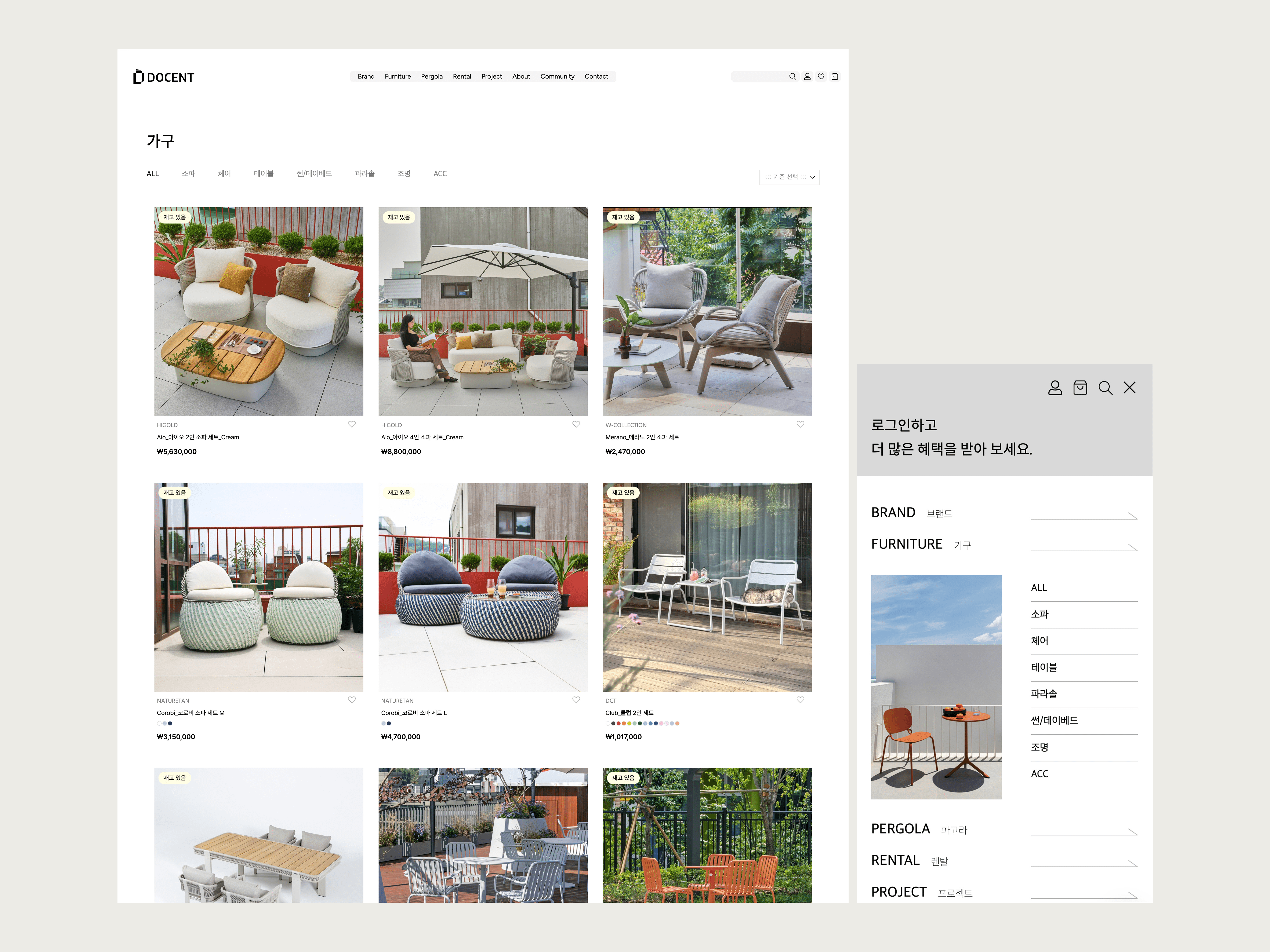 DOCENT의 브랜드 이미지를 온라인에서도 일관되게 전달하기 위해 진행한 공식 웹사이트 리뉴얼 프로젝트입니다. 브랜드가 지향하는 라이프스타일 무드가 자연스럽게 드러나도록 웹 디자인의 전체적인 방향성과 콘텐츠 구조를 기획했습니다. 레이아웃 스케치, 이미지 선택, 주요 문구 구성 등을 통해 DOCENT만의 공간적 감성과 제품의 매력을 명확하게 표현했습니다.