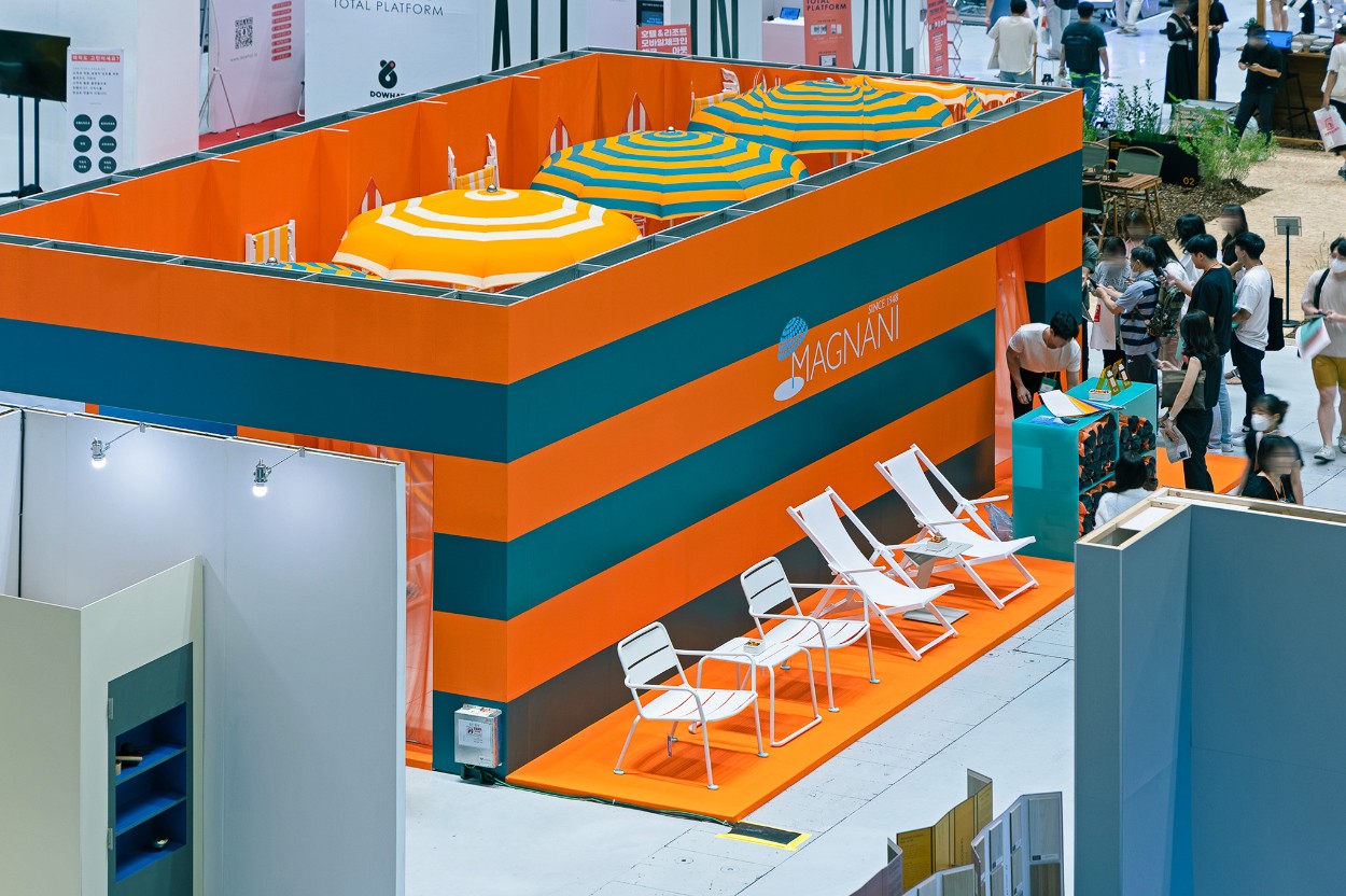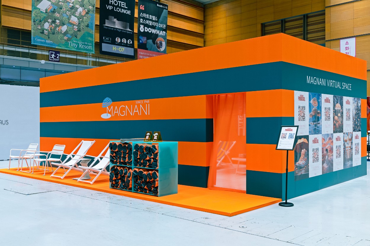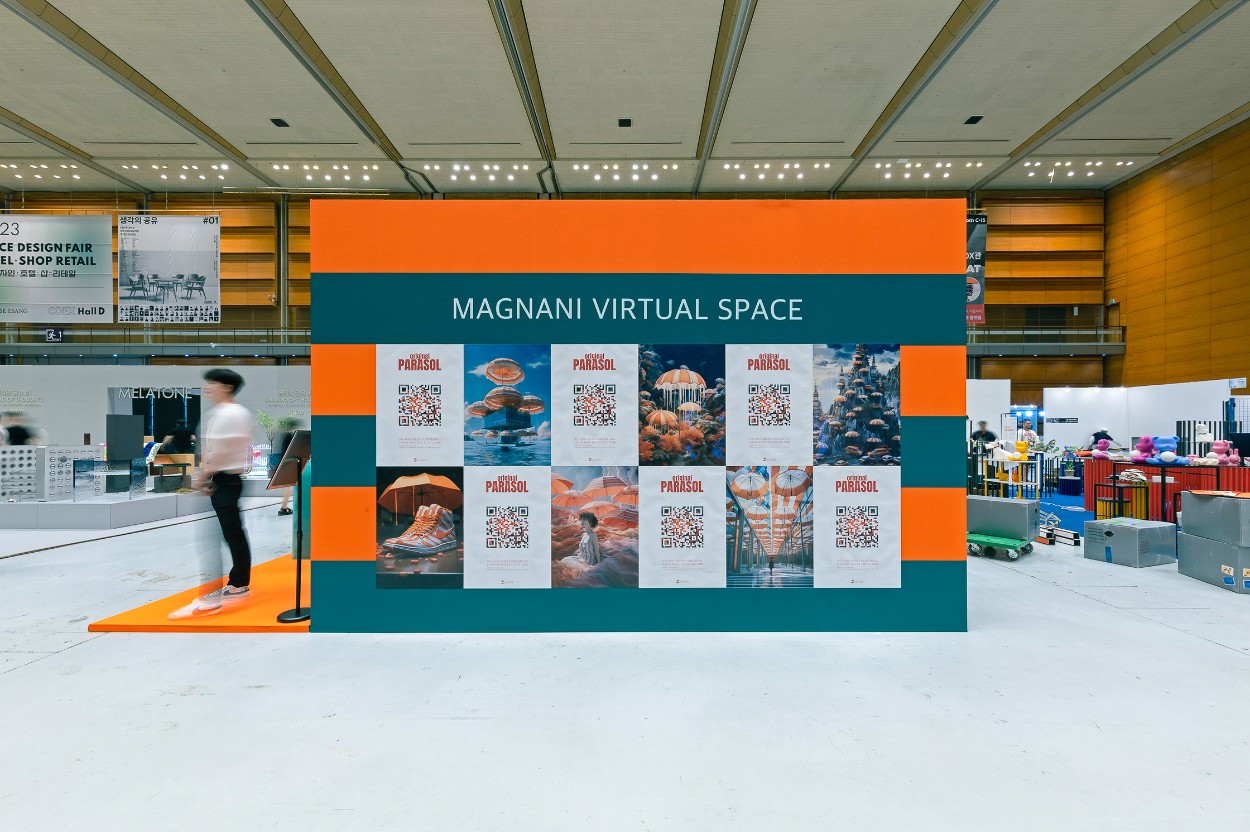 For MAGNANI’s first official launch in Korea at the 2023 Hotel Fair, I designed an exhibition space that highlighted the brand’s signature identity. Using MAGNANI’s bold orange color and stripe pattern, the booth delivered a striking visual experience, and I oversaw the entire process from spatial direction and exhibition planning to event operations and printed materials. I also created an AI-generated “Parasol” poster series, connecting the physical installation with a digital experience.