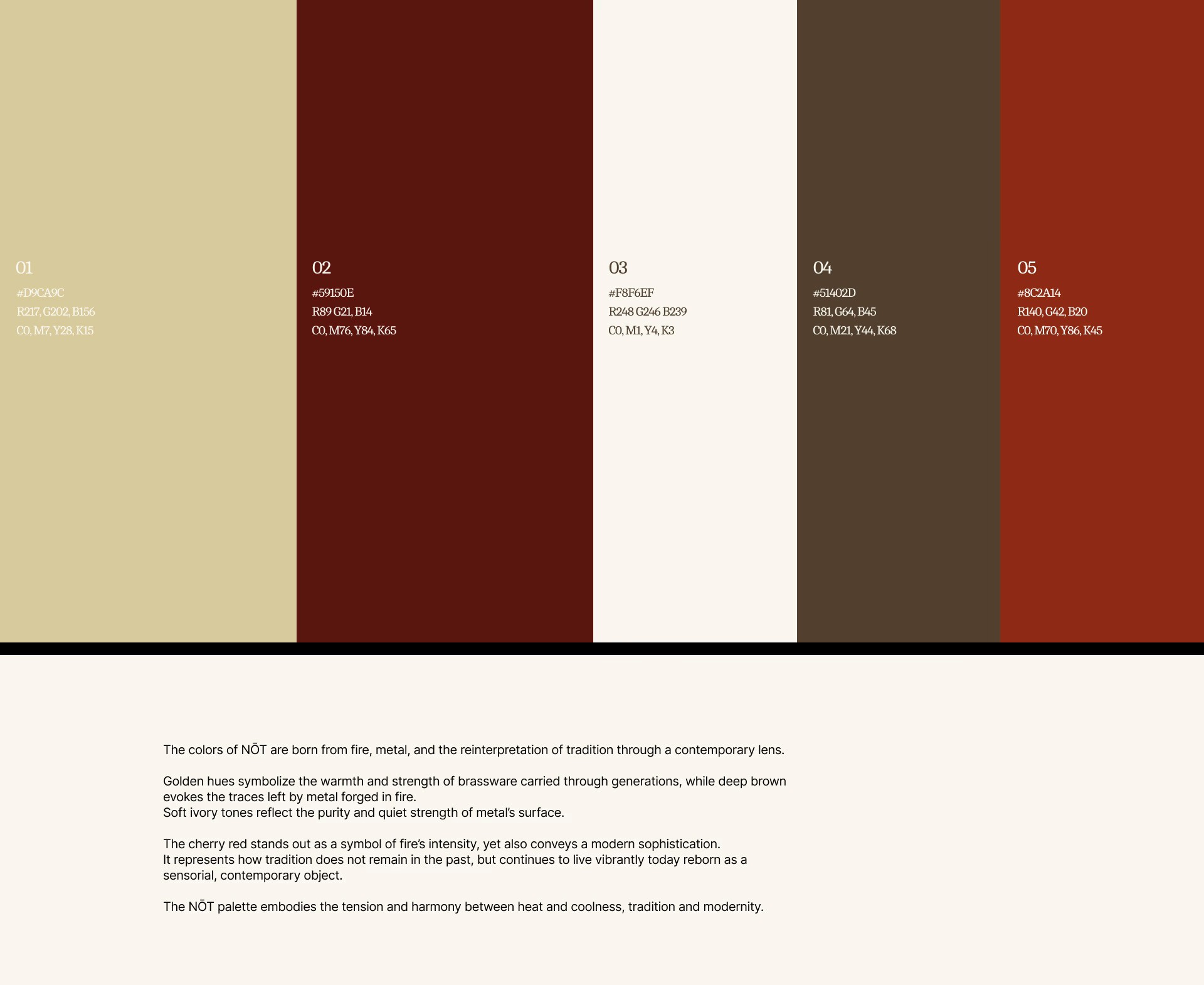 금속의 견고함을 감각적 오브젝트로 확장하며 전통 그릇을 새로운 방식으로 경험하게 합니다. NŌT은 전통을 단순히 보존하는 것이 아니라, 차갑고 묵직한 금속 안에 담긴 시간의 온기를 오늘의 공간 미감으로 다시 제시합니다. 전통이 오늘의 라이프스타일 속에 자연스럽게 살아 숨 쉬도록 함으로써, NŌT은 전통과 현대, 열기와 고요, 강인함과 섬세함이 공존하는 오브젝트를 만들어냅니다.
