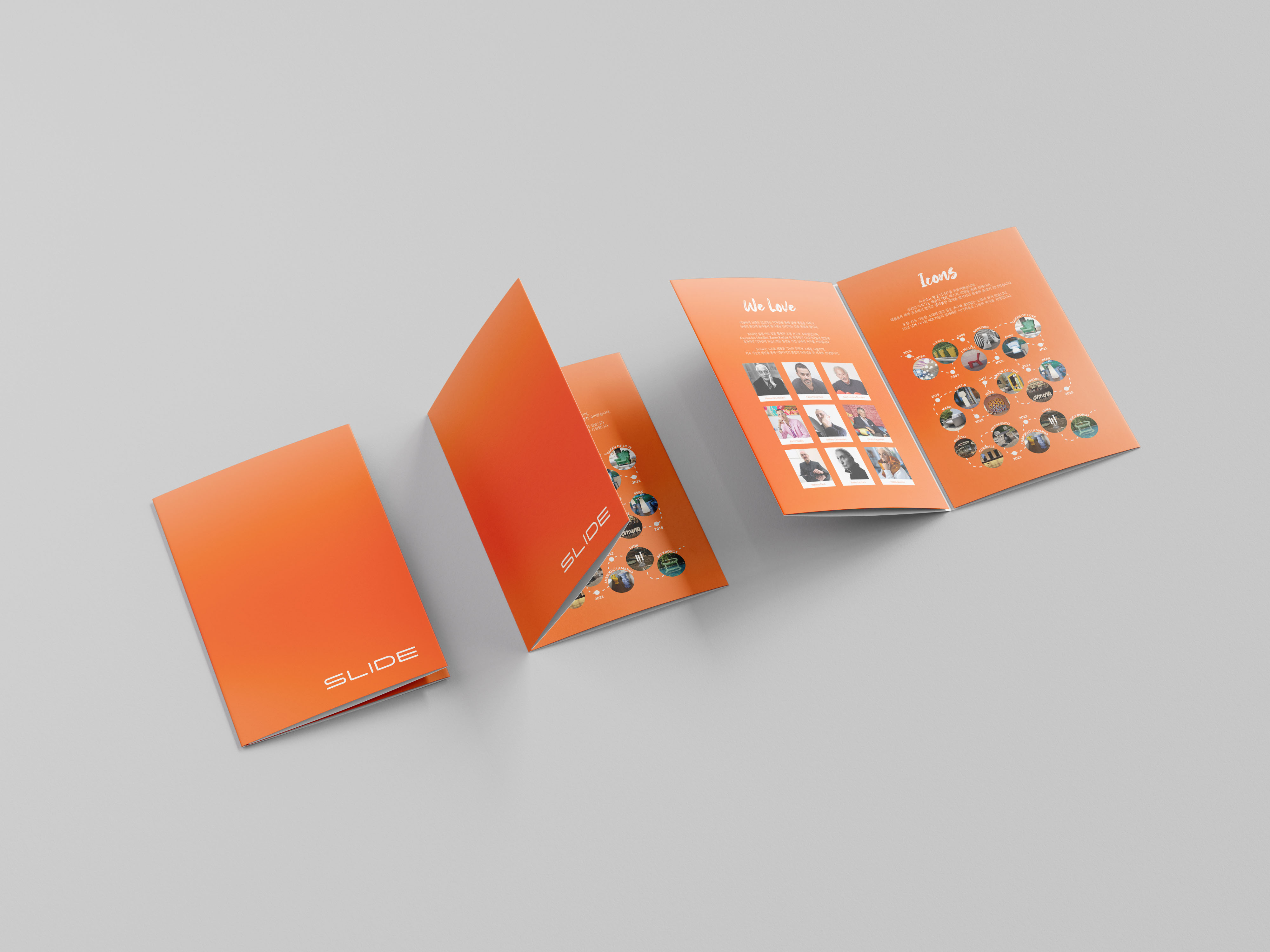 This four-fold leaflet was created for the 2025 launch of the SLIDE brand. Utilizing the brand’s signature orange color, the design features a refined gradient that reflects SLIDE’s energetic yet sophisticated identity. The layout organizes brand information, featured artists, and icon content in a clear and engaging format.